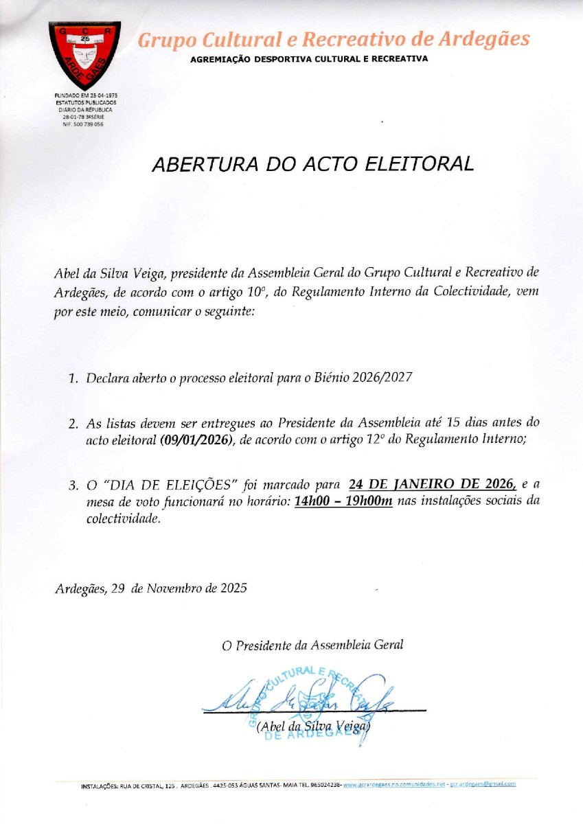 Abel da Silva Veiga, presidente da Assembleia Geral do Grupo Cultural e Recreativo de Ardegães, de acordo com o artigo 10º, do Regulamento Interno da Colectividade, vem por este meio, comunicar o seguinte: